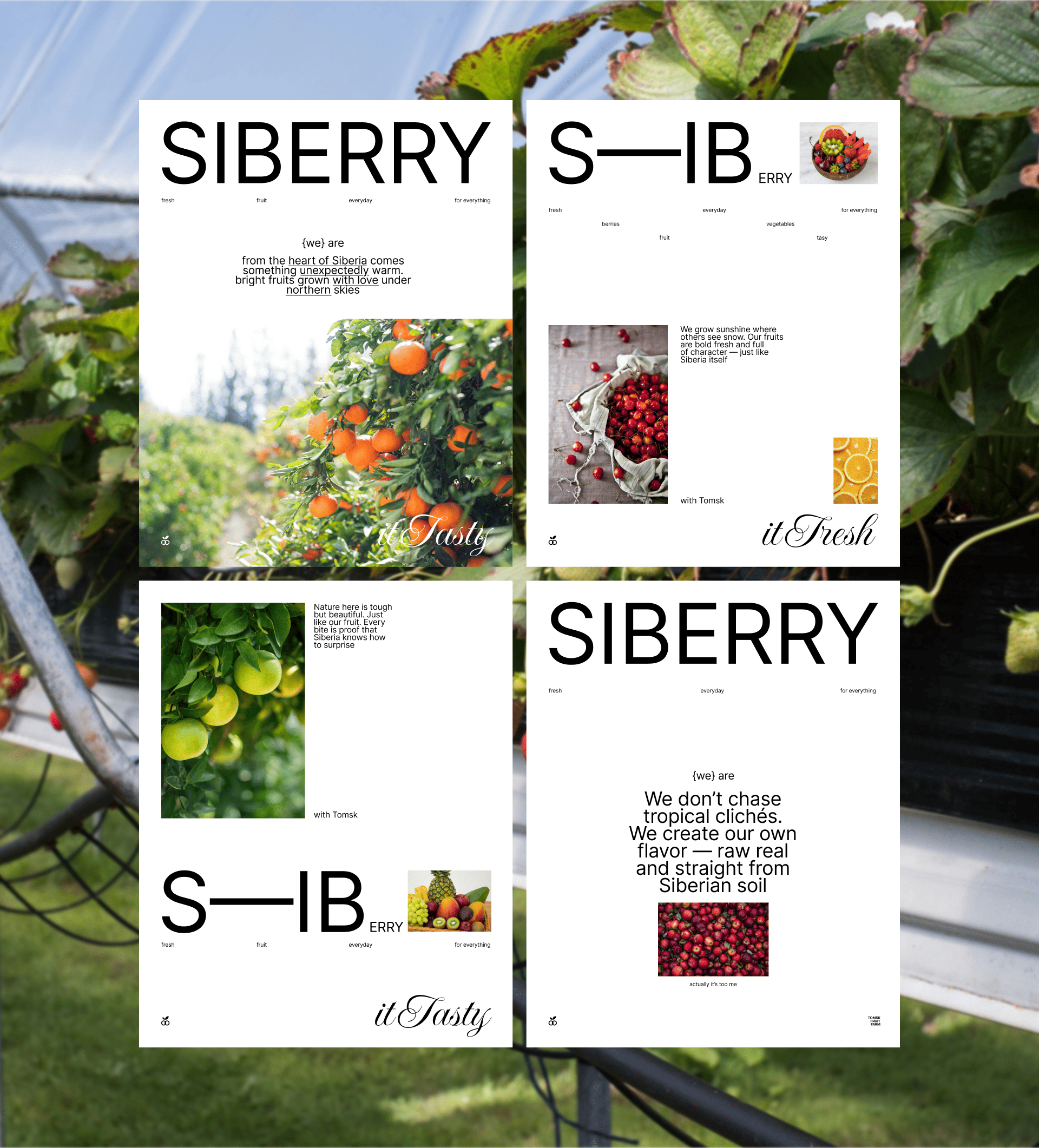 A series of identity visuals was developed for a Tomsk-based startup. The main idea was to convey the precision of production in the Siberian hinterland and the freshness of the product.